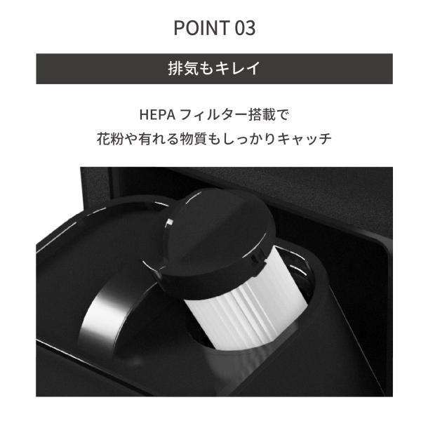 ■排気もキレイ、HEPAフィルター搭載で花粉やアレル物質もしっかりキャッチ