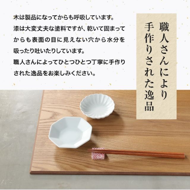 日本有数の漆器の産地、石川県山中塗の漆器です。木は製品になってからも呼吸しています。漆は大変丈夫な塗料ですが、乾いて固まってからも表面の目に見えない穴から水分を吸ったり吐いたりしています。職人さんによってひとつひとつ丁寧に手作りされた逸品をお楽しみください。