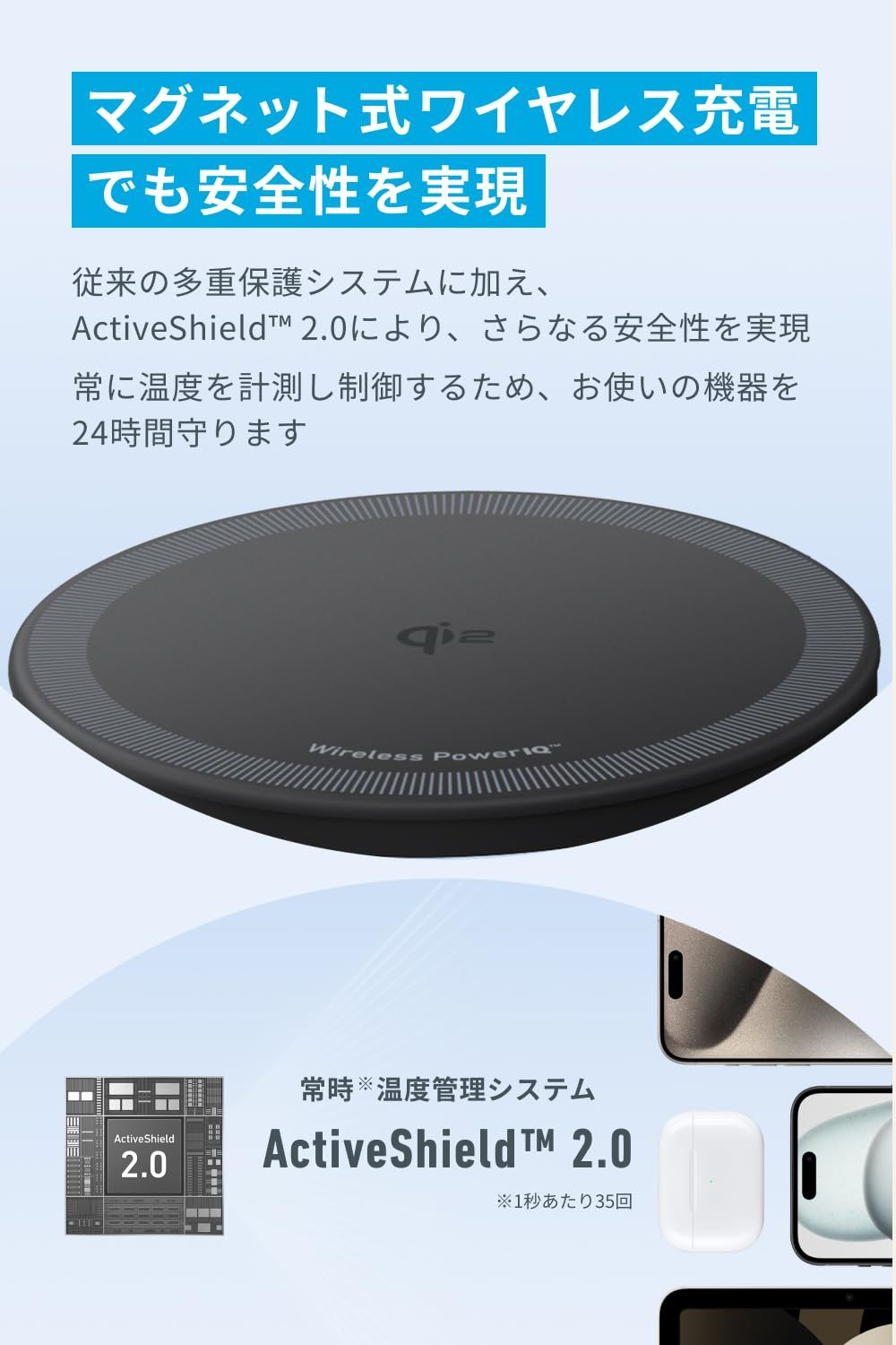マグネット式ワイヤレス充電でも安全性を実現:従来の多重保護システムに加え、 Active Shield 2.0により、さらなる安全性を実現。常に温度を計測し制御するため、お使いの機器を24時間守ります。