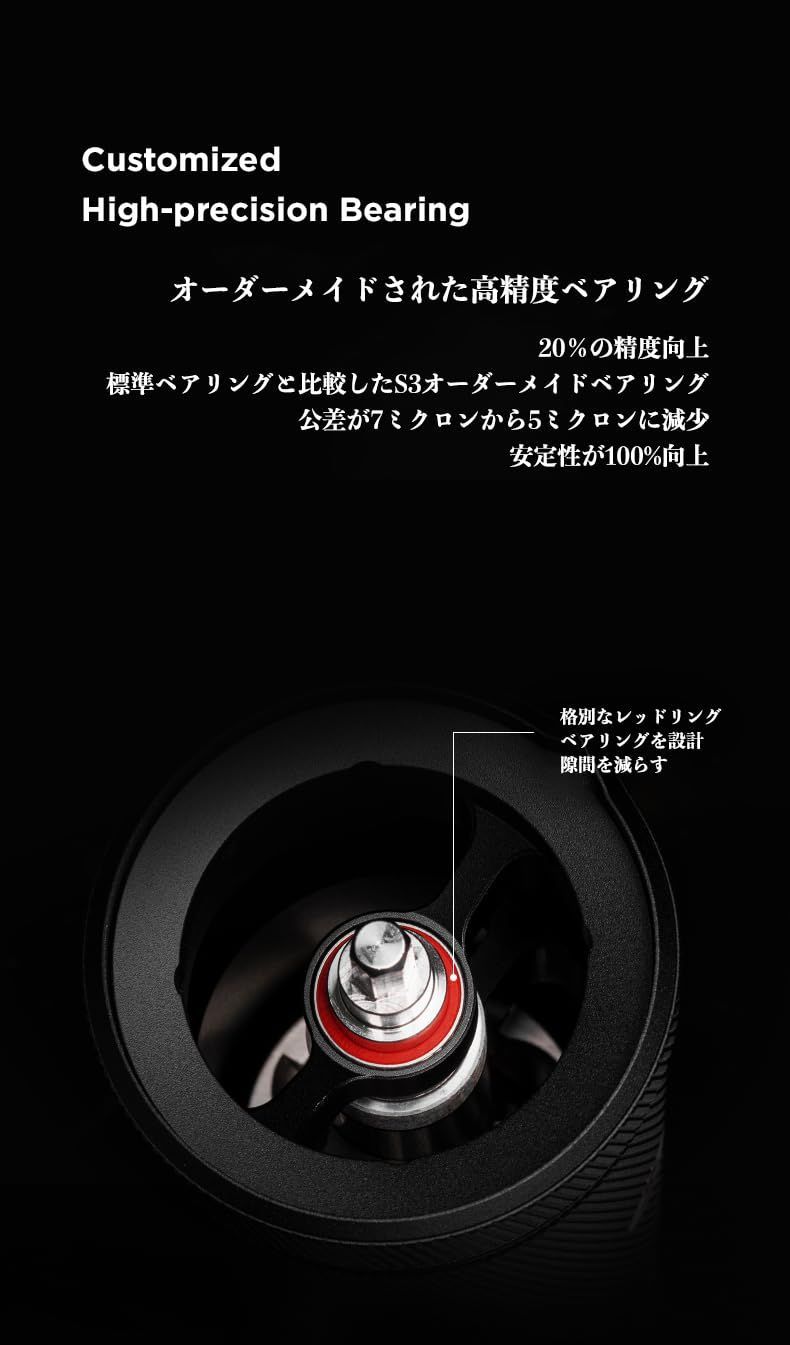 2.【優れた刃】:S2C890 (Spike to Cut/突き刺してから切る) という新規設計の臼刃です。五軸CNC高精度加工が施された、硬度55-58HRCの臼刃を採用。均一な挽目を実現し、同時に微粉の発生も最小限に抑えるので、雑味が少なくクリアな味わいをお楽しみいただけます。