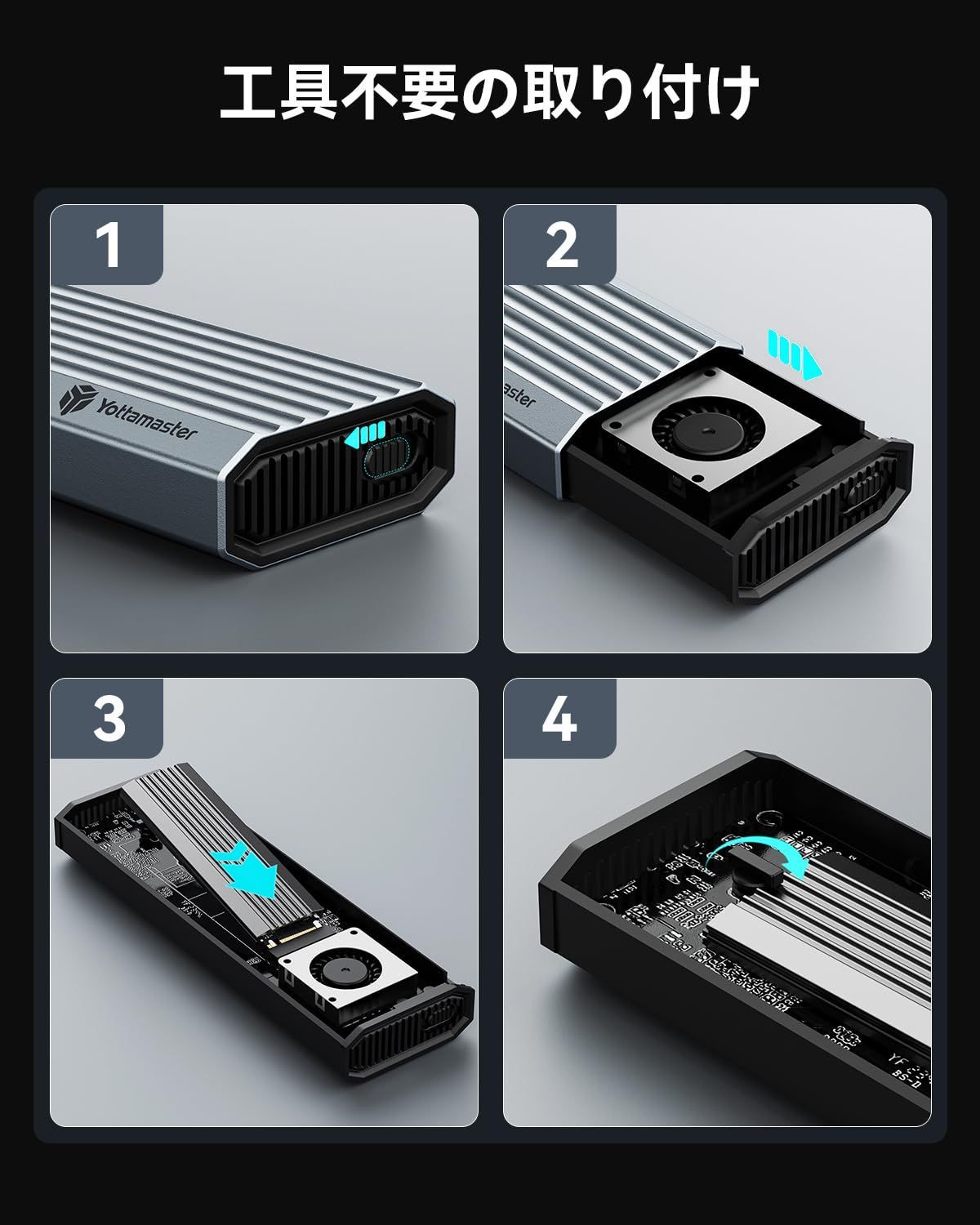 Yottamaster 40Gbps M.2 NVMe SSDエンクロージャ、ツールレスアルミニウムNVMeエンクロージャ、4TB M.2 NVMe 2230/2242/2260/2280(Mキー)対応、Thunderbolt 4/3/USB4/3 .2.1.1対応。