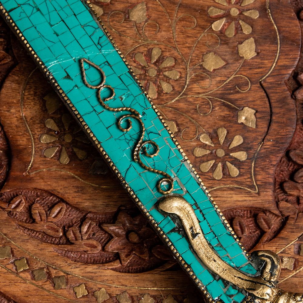 ネパールから届いた神秘的な法具です。こちらは文殊菩薩(マンジュシュリー)や不動明王が手にしている宝剣・利剣です。武具としての意味合いもありますが、煩悩を断ち切り悟りに至る智慧の象徴としての意味合いが大きい法具になります。すらりと引き締まったシルエットに力強さが宿る、美しい造形ですね。