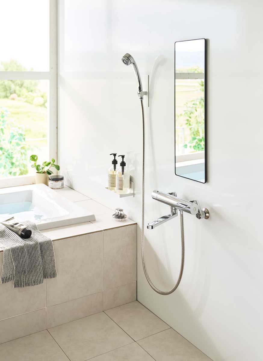 美しく、透明感があるロングサイズの角型ガラス製バスルームミラーです。フレームと壁の隙間に指を入れて取り外しやすい形状なので、お掃除がしやすく清潔に保てます。曇り止めフィルムを全面に粘着加工しているため、鏡面が曇らず快適にお使いいただけます。