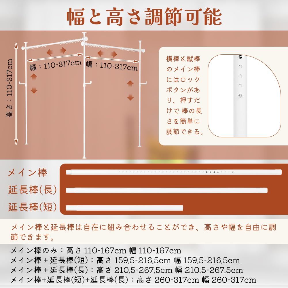 縦横伸縮可能:横棒と縦棒のメイン棒と延長棒の本数によって、カーテンレール突っ張り式の高さと幅を調節できます。また、メインバーのロックボタンを押すことで、ポールの長さを簡単に調節できる。メイン棒のみ:110-167cm、メイン棒+延長棒(短):159.5-216.5cm、メイン棒+延長棒(長):210.5-267.5cm、メイン棒+延長棒(短)+延長棒(長):260-317cm。直線設置時は最大624cm