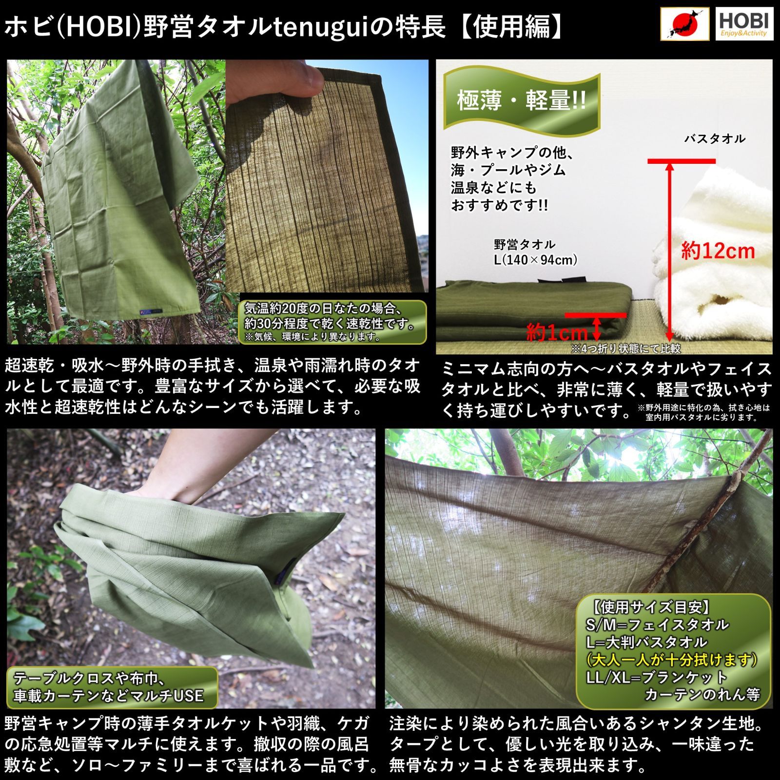 ●特長②超大判バスタオル ●和のテイストを活かした無骨なカラー。Lサイズ(140×94cm)はキャンプ時のシャワーや急な雨の際、身体を拭くことが出来る野外用バスタオルです。海、プール、温泉、銭湯の使用、またはスポーツジムで汗を流した後のタオルとしても抜群です。通常のバスタオルと比べても1/10の厚みで、携帯しやすいです。※携帯性と速乾性を追求した屋外向け仕様ですので拭き心地は通常のバスタオルより劣ります。