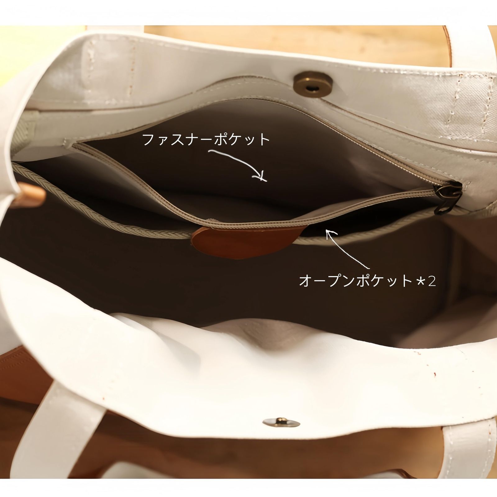 ★作品説明 ・サイズ:横38㎝×縦31㎝×マチ12㎝ ・ポケット:内/オープン2ファスナー1、外/ファスナー1 ・重量:約500g ・メイン素材:キャンバス 帆布 ・部分素材:ヌメ革(本革) 撥水加工した帆布にヌメ革のアクセントがカジュアルに都会的なおしゃれを感じさせるデザイン。 シンプルで丈夫、いずれも職人の丁寧な手仕事で作られた品、ハードユースにも耐えられる丈夫なもの。天然綿が醸す質感に加え、使うほどに増す風合いも魅力です。 伝統の技と帆布への愛情で生み出される温かみのある品々で、暮らしに彩りを添えていただけると嬉しいです♪ ?帆布生地について パラフィン帆布を使用しております。パラフィン加工とは、帆布などの生地にロウを染み込ませることで撥水効果をもたせる、昔から使われてきた防水のための技法です。パラフィン加工をほどこした帆布のことをパラフィン帆布といいます。パラフィン帆布製品は擦れたり折れたりした部分に白っぽい跡(チョークマーク)が付きます(製造過程にもチョークマークがつくことがあります、汚れではありません)。これはパラフィン最大の特徴で、パラフィンらしさでもあります。またパラフィンそのものも色が徐々に変化するため、時間をかけ使い込むことで経年変化し、なじんでいきます。そのため、革製品などと同じように経年による変化も楽しめるという特徴があります。♪ ?ヌメ革について 植物由来の成分であるタンニンを使用して、鞣(なめ)された皮革のことです。鞣す工程で革の繊維が締るため、非常に丈夫な素材ですが、扱うたびに手になじんで滑らかになり、 色艶と共に光沢が増して、革の表情が変化していきます。天然の皮革ですので血スジ、キズ、シワ、匂い、色むら等ある場合がございます。 ?お手入れについて パラフィン帆布には撥水効果がありますので、お洗濯はなるべく避けてください。日々のお手入れにはブラッシングが最適です。 もしも汚れてしまった場合は、固く絞った布で叩くように拭き落としてください。 強くこすってしまうと、その部分だけ色落ちしてしまいます。それでも落ちないような汚れは、なかなか落とすことが難しいです。使っていくうち汚れやキズは、味わいの一つとしてお使いください。