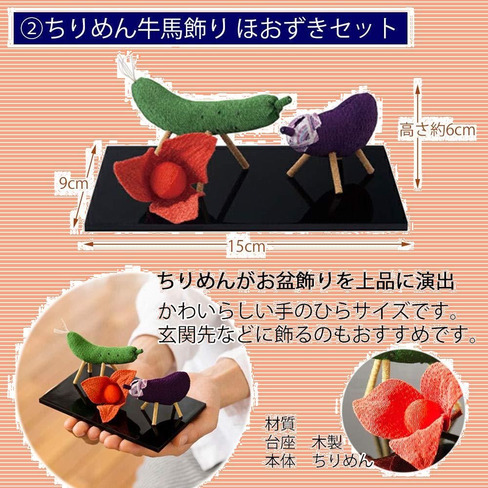 【商品詳細】セット内容:①置き型 白紋天 小珠セット(白/撫子)、②ちりめん 牛馬飾り(台付)、③ちりめん お供物セット(台付) / 各商品サイズ:画像をご確認ください。