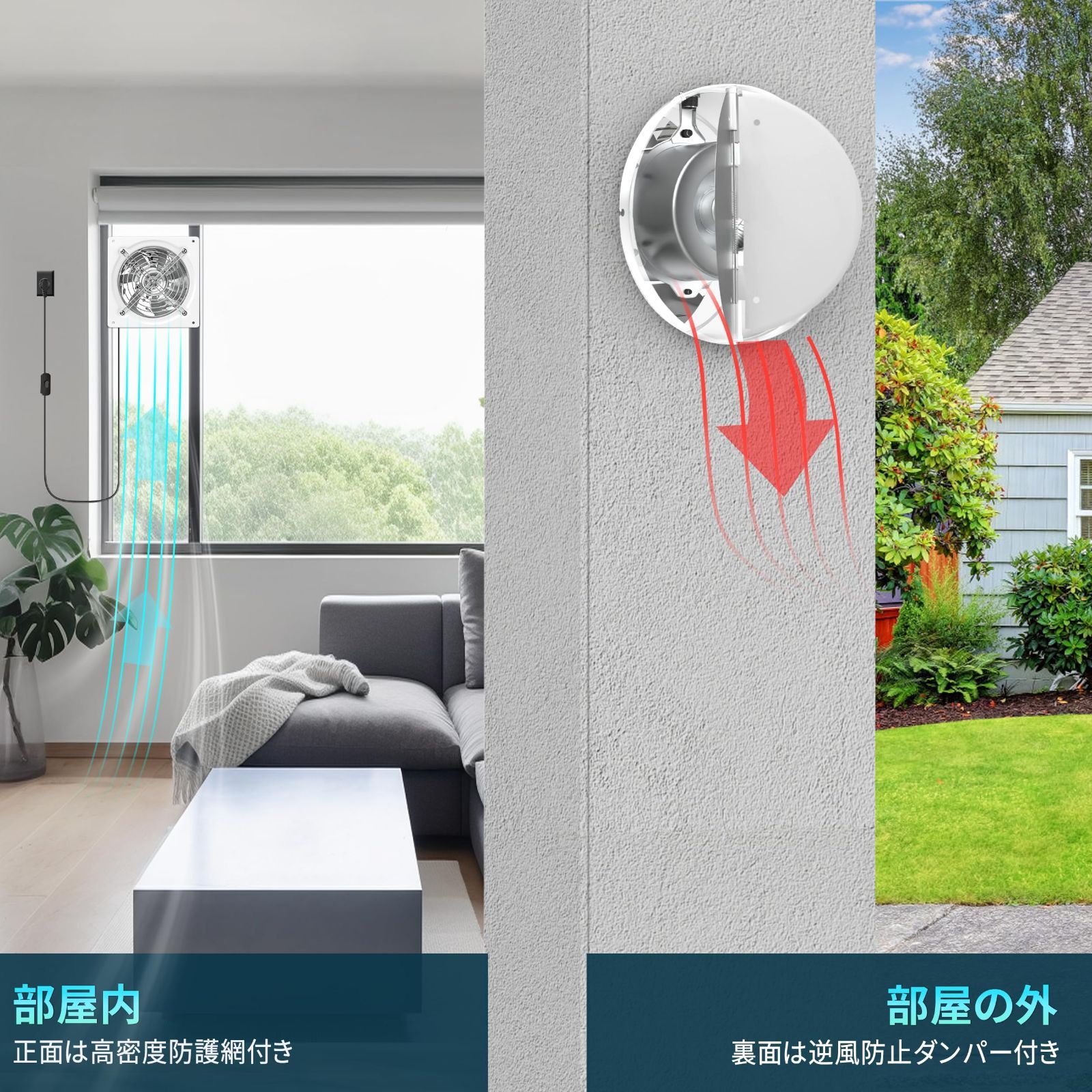 【高密度防護網&逆風防止ダンパー 】換気扇の前には高密度な金属防護網を採用され、羽根の高速運転中に異物が巻き込まれるのを防ぐだけでなく、身体接触による怪我も防ぎます。後ろ側は逆風防止ダンパーが付き、ほこり、虫、綿、雨水などの侵入を強力に防ぎ、屋外の空気が逆流するのを防ぎます。ご注意:天井に取り付ける場合、まず逆風防止ダンパーを取り外してください、そうしないと、製品風量に影響します。