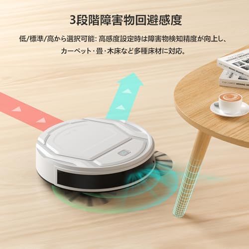 3段階障害物回避感度低/標準/高から選択可能:高感度設定時は障害物検知精度が向上し、カーペット・畳・木床など多種床材に対応。