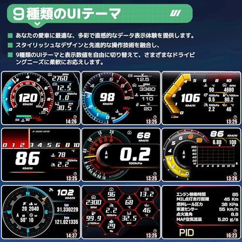 高精度センサー搭載: 水温計、電圧計、ブースト計などを正確に測定。9つのテーマ画面を搭載し、表示スタイルを好みに応じて切り替え可能。故障コードリーダーも搭載。