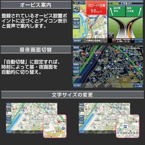 【オービス案内・昼夜画面切替・文字サイズの変更】登録されているオービス設置ポイントに近づくとアイコン表示と音声で案内します。「自動切替」に設定すれば、時刻によって昼・夜画面を自動的に切替ます。地図の縮尺変更とは別に地名や交差点位置などの文字サイズを3段階から選択可能です。