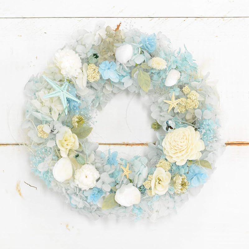 ブルーのベースに季節のお花たちそして貝をお入れしています。 ブルー1色だとちょっと平坦なイメージになり寒々しくなるので ほんのり色の違うブルー3色を使って 海の波の泡の白と 深い海の色に近いグレーのようなグリーンのようなお色のハイドランジアを入れました。 白いふんわりしたシサル麻も使ってふっくらと仕上げています。OPパックにお入れしリース専用ボックス(中が見えないタイプ)にお入れさせていただいておりますのでそのままプレゼントにもお勧めです。 耐久性の強いワックスコード(蝋引きした紐)をつけさせていただいております。 開け閉めの多いドア・直射日光の当たる場所 湿気の多い場所を極力さけて飾っていただければと思います。