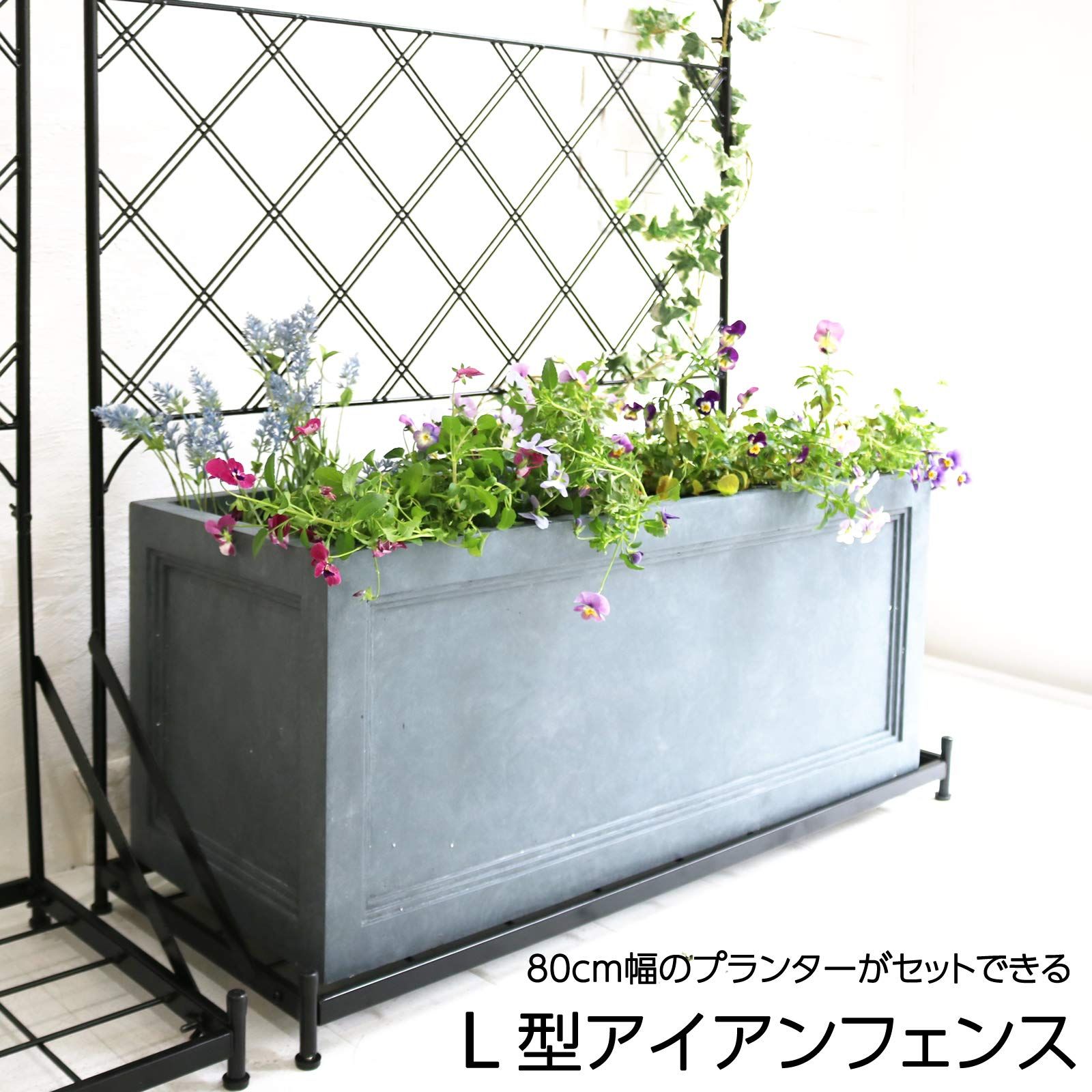 幅約86cmまでのプランターが重しとして置ける、プランター台付き斜め格子のアイアンフェンスです。高さはロータイプとハイタイプの2種類、カラーはブラックとホワイトの2色展開!間仕切りや目隠し、ハンギングスタンドや緑のカーテン、つる性の家庭菜園など活用方法はいろいろ!足元は高さの微調整ができるアジャスター付き。フェンス単体に加えて、衝撃に強く高耐久な重厚感たっぷりのファイバークレイのプランターのセット商品もご用意しています。「カラー」「サイズ」メニューよりお選びください。