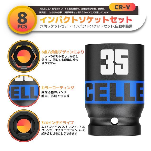 このインパクトソケット、車の修理やメンテナンスに使用できます。26mm〜38mmの8ピースドライブインパクトソケットセット一式。含む:26mm27mm29mm30mm32mm35mm36mm38mm計8個。車やバイク整備から日曜大工まで使用頻度の高いサイズを網羅.頑丈なクロームバナジウム鋼に。耐摩耗性や耐久性が高く、大きな負荷にも割れずに耐えられます。一般の鋼と比べ、硬いだけでなく柔軟性があるので、錆びたボルトに必要なトルクを受け止め、割れることなくボルトを緩めることができます.本製品は広く使用されています農業機械な、各種整備や修理、機械類、家具類、バッテリー交換、建設現場など様々なシーンで大活躍しています.目立つサイズのマーキングで簡単に識別できます。でサイズを分けし、必要なインパクトソケットを素早く簡単に識別。製品の収納により便利にできますように、製品専門の収納ケースが付き、コンパクトで作業現場まで持ち運びも便利です.6点六角形デザインにより、ファスナーのグリップが向上します。6点六角設計は高トルク下でも丸みにくく、衝撃時のファスナーへの圧力を軽減します.
