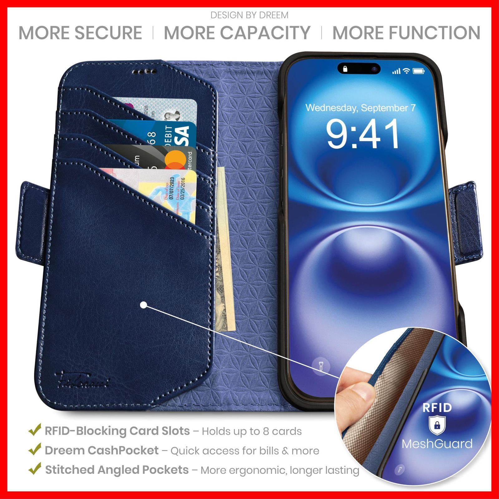 多機能スマホウォレット - 4つのカードホルダースロットにRFID保護機能を搭載、3~6枚のクレジットカードと5~10枚の紙幣を快適に収納できます。開きやすいクラスプ - ウォレットを簡単に開閉できます。スマートな、水平方向と垂直方向の視聴を可能にするキックスタンド、完全に調整可能なので、どこでもハンズフリーでビデオ通話、読書、映画鑑賞ができます。