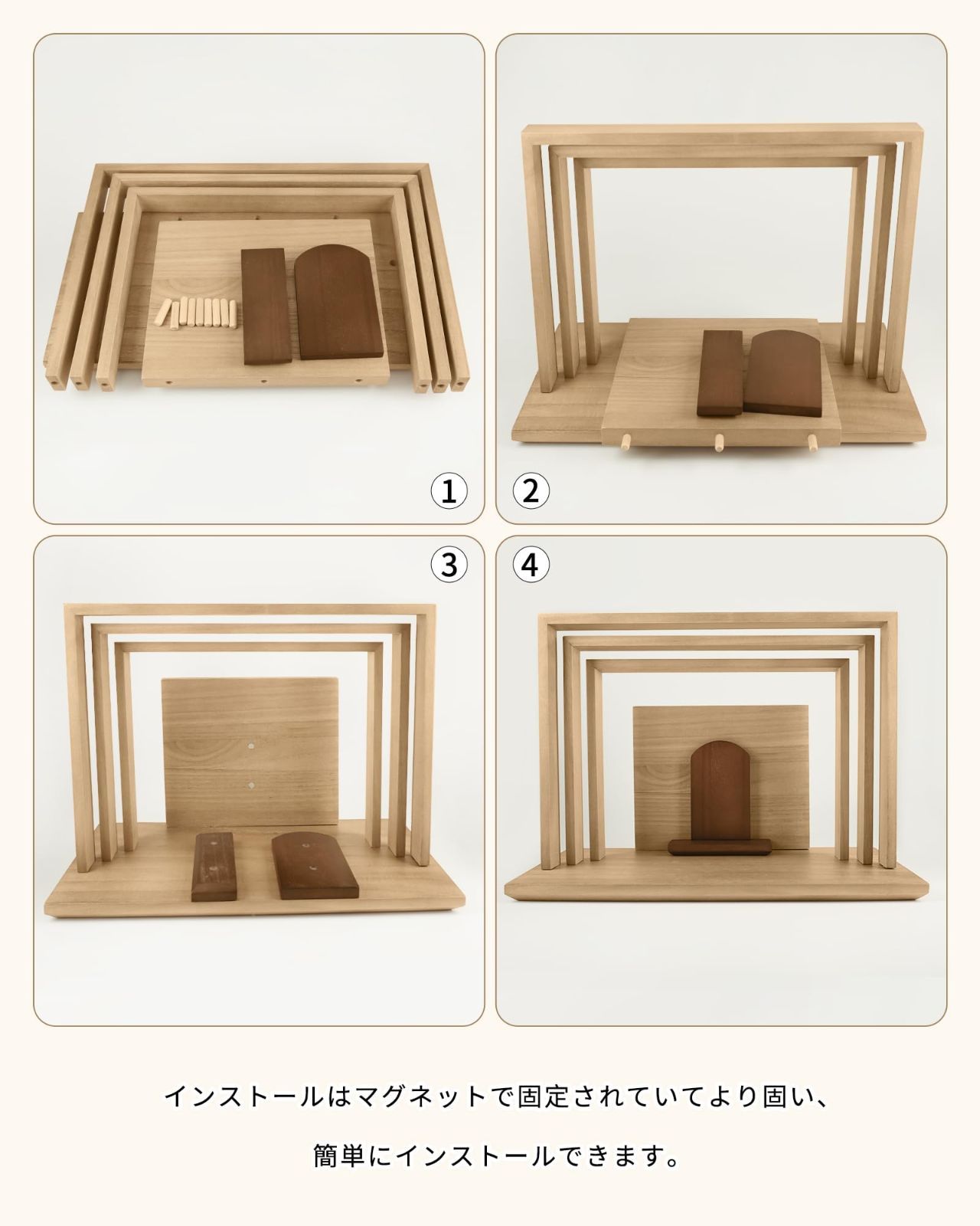【組み立て簡単な仏壇】本体サイズ:42cmX20cmX30cm、お位牌4.5寸以内に対応、操作しやすいにマグネットが埋め込まれて固定し便利です。簡単に置くだけで組み立て完了、ほっこりと優しい気持ちになれます。置き場所の幅を取らないオープン型、ちょっととしたスペースで設置もできます。
