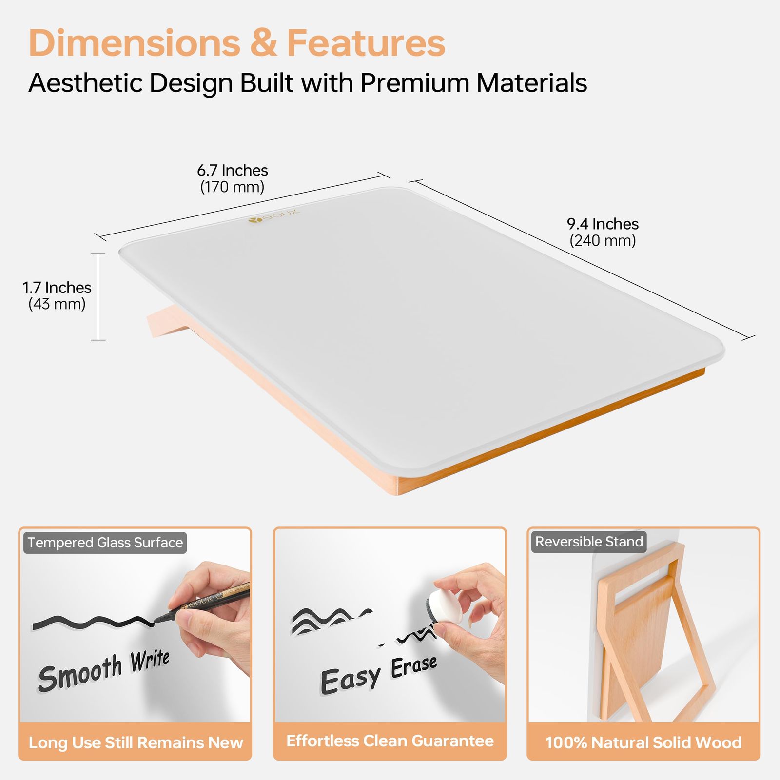 プレミアムハンドクラフト | 天然無垢材とウルトラホワイトの強化ガラスで手作りされた小さなホワイトボード。細心の注意を払っています。