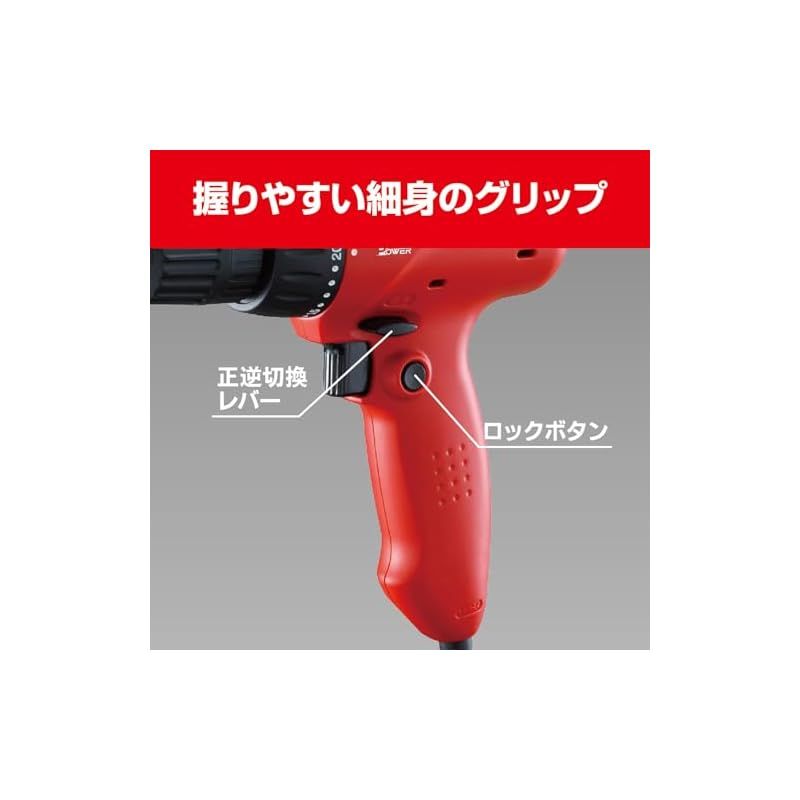 ネジ締め能力:3.8mmトルク:(クラッチ)20段 0.6~3.0N・m (ドリル)6.4N・m チャック能力:1.0~10mm 回転数:540min-1 電源:単相100V 電流:0.8A 消費電力:70W 質量:0.8kg サイズ:長さ192×幅59×高さ187mm 付属品:鉄工キリ(2・3・4・5mm)、+ドライバビット(No.2×65)、キャリングケース、ビットホルダ、ソケットアダプタ、六角ソケット(5・6・7・8・10・11mm)
