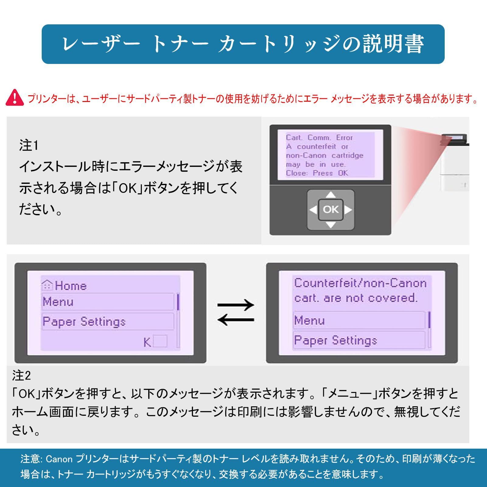 【注意】プリンターに「Canon 純正モード」がある場合は、このモードを閉じる必要があります。次手順に従て、Canon 純正モードを閉じてください: [管理設定] > [デバイス管理] > [Canon 純正モード] > [オフ]。Canon 純正モードを閉じた後、 互換性のあるトナーをインストールすると、プリンターに「Canon 以外のカートリッジが挿入されている可能性があります」というメッセージが表示されます。単機能プリンターの場合は「OK」キーを押す、多機能プリンターの場合は画面で「閉じる」をクリックするだけで、トナーが機能するはずです。