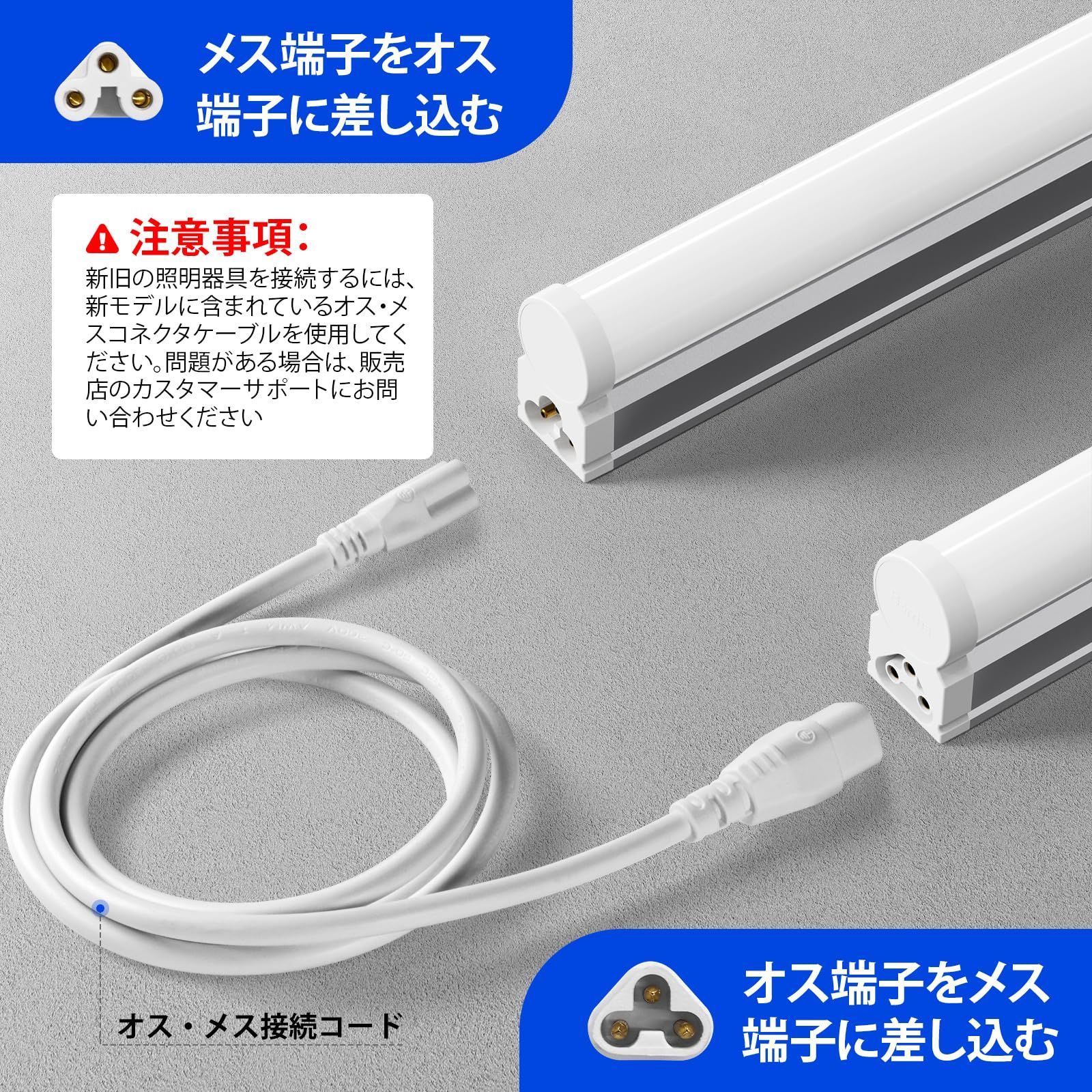 6本入り LED蛍光灯品質:3年間無制限、品質に問題がある場合は、簡単かつ迅速に交換します。付属品:1.5m電源スイッチ線×6 、連結コネクタ×6、1.2m連結ケーブル線(工事不要)×5、連結ケーブル線(接続工事要)×2、固定金具 ×6、ネジ ×6、保護キャップ×6