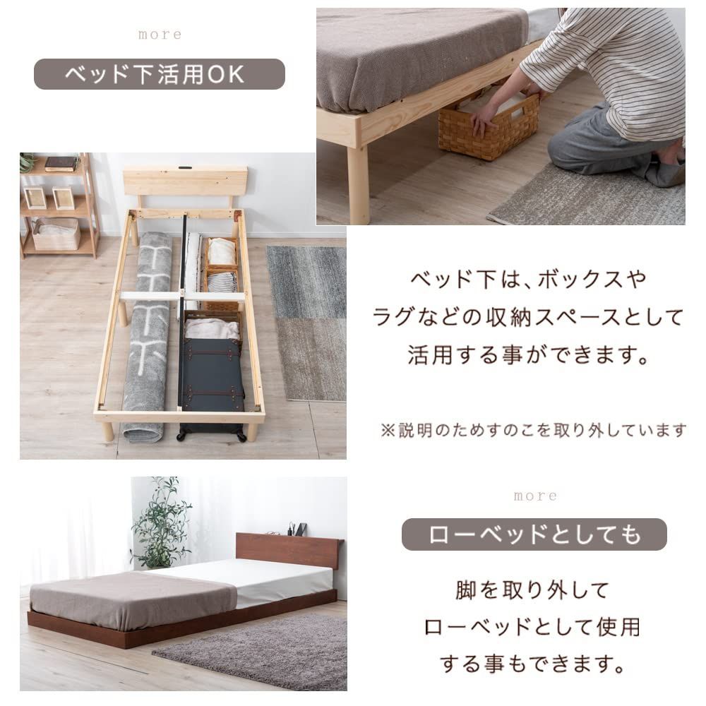 【スタッフのおすすめポイント】 ・枕元に小物を置ける宮棚付き ・寝ている間にスマホの充電が可能なコンセント2口付き ・ほこりが入りにくいスライド式コンセント ・天然木パイン使用 ・通気性抜群のすのこ仕様 ・脚を取り外してローベッドとしても使用可能 ・お子様にも安心のFフォースター塗装 ・2台を隙間なくぴったり並べてキングサイズに