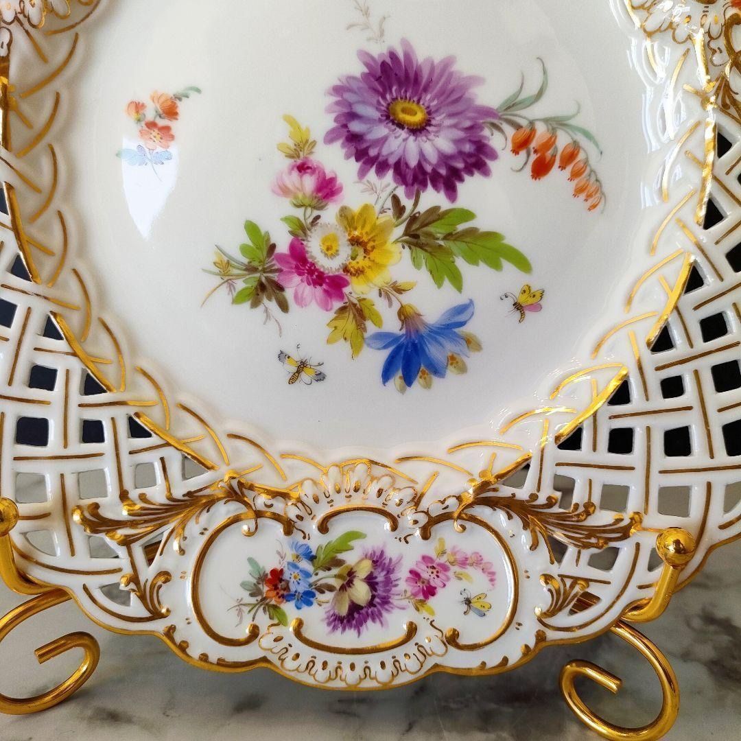 MEISSEN マイセン 1級品 フラワーブーケ 昆虫 金彩 透かし オープンワーク プレート 20.5 cm ピアスエッジ