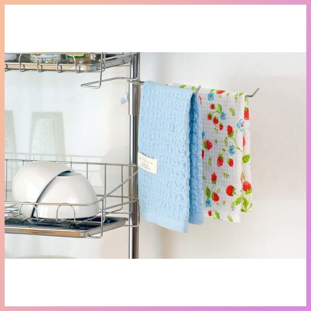 幅がスリムで狭いキッチンスペースでも有効に使えるラック。突っ張り固定式なので設置でキッチンを傷めません。調理中の「ちょっと洗ってまた使う」包丁・ザル等の調理用具の一時置きやコップ類の水切り収納、スパイスラックとしてお使いいただけます。布巾掛け、箸立て、シートまな板立て、フック、トレーがついた、コンパクトに活躍するラックです。