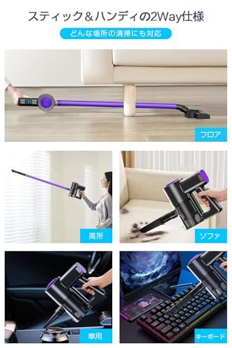【驚異の26,000Pa超強力吸引&多機能ノズルで家中スッキリ】2025年進級版のこの掃除機 コードレスは、最大26,000Paのパワフルな吸引力で、フローリング、カーペット、畳、カーテンや車内まであらゆるゴミを一気に吸引!サイクロン式構造で微細なホコリ・花粉・ダニも逃さずキャッチ。付属の多機能ノズルでソファの隙間や階段など細かい場所にも対応。スティックークリーナーとしてもハンディークリーナーとしても使える2in1設計で、家中の清掃がこれ1台で完結!