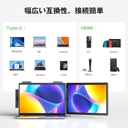 【プラグ&プレイ、ドライバー不要】このノートパソコン用ポータブルデュアルモニターは、必要なケーブル(Type-C-Cケーブル1本、USB-C-USB-Aケーブル1本、HDMIケーブル1本)が全て付属しています。追加のドライバー不要で、Type-Cポート対応のPCなら、1本のケーブルで接続可能。HDMI対応デバイス(デスクトップ、ラップトップ、ミニPC、ゲーム機など)も、付属のHDMIケーブルとUSB-A to USB-Cケーブルで簡単に接続できます。※USB C接続の場合は、パソコンのUSB Type-C ポートが映像出力(DisplayPort Alt Mode)対応が必要です。※給電が足りない場合は付属のACアダプターをご使用ください。