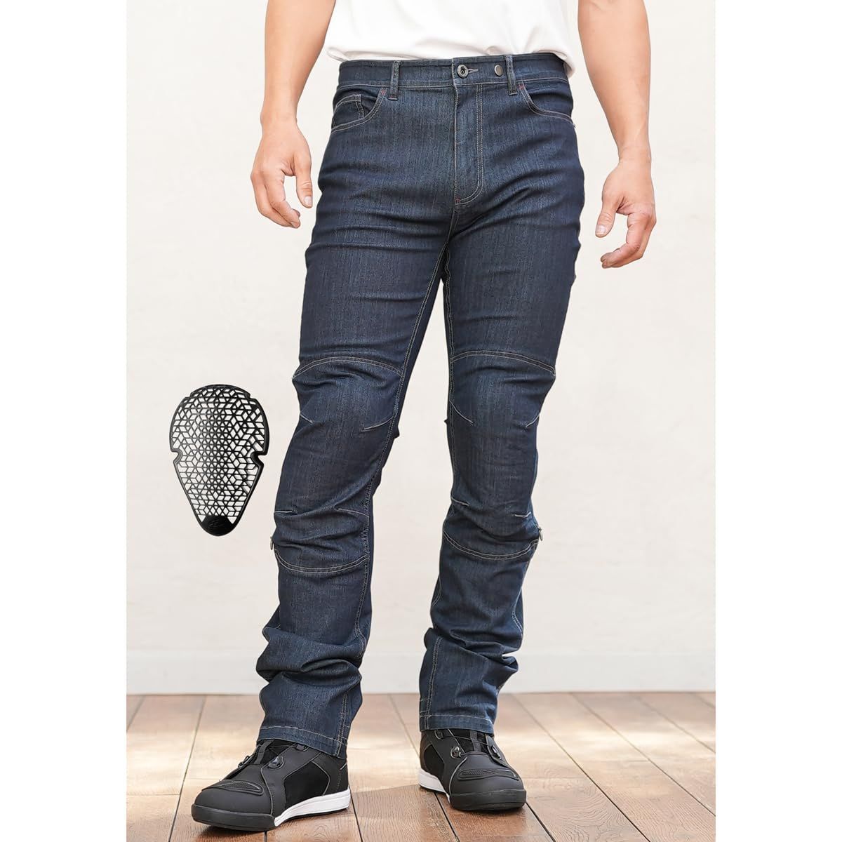 クールマックス繊維を生地に織り込んだ夏用ライディングジーンズ。高い伸縮性で快適なフィット感を実現し、涼しくドライな穿き心地。 膝には薄型で通気性に優れたCEレベル1プロテクターを標準装備。