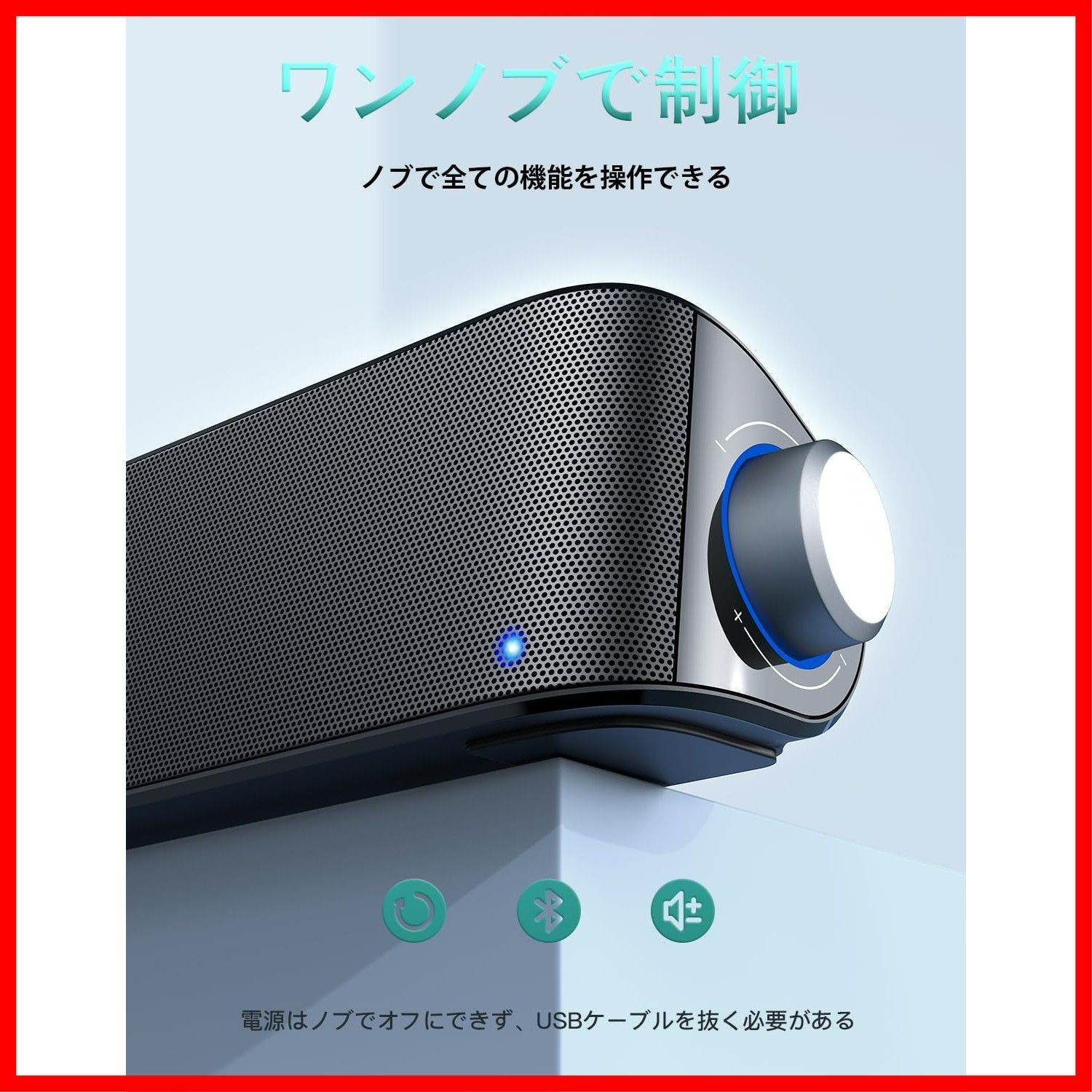 【USB給電&ワンノブ操作】 Nylaveeのサウンドバーには内蔵バッテリーはありません。USBケーブルを電源に接続し、自動的に電源がオンになります。一つのノブで音量調節や再生停止などの操作が可能です。