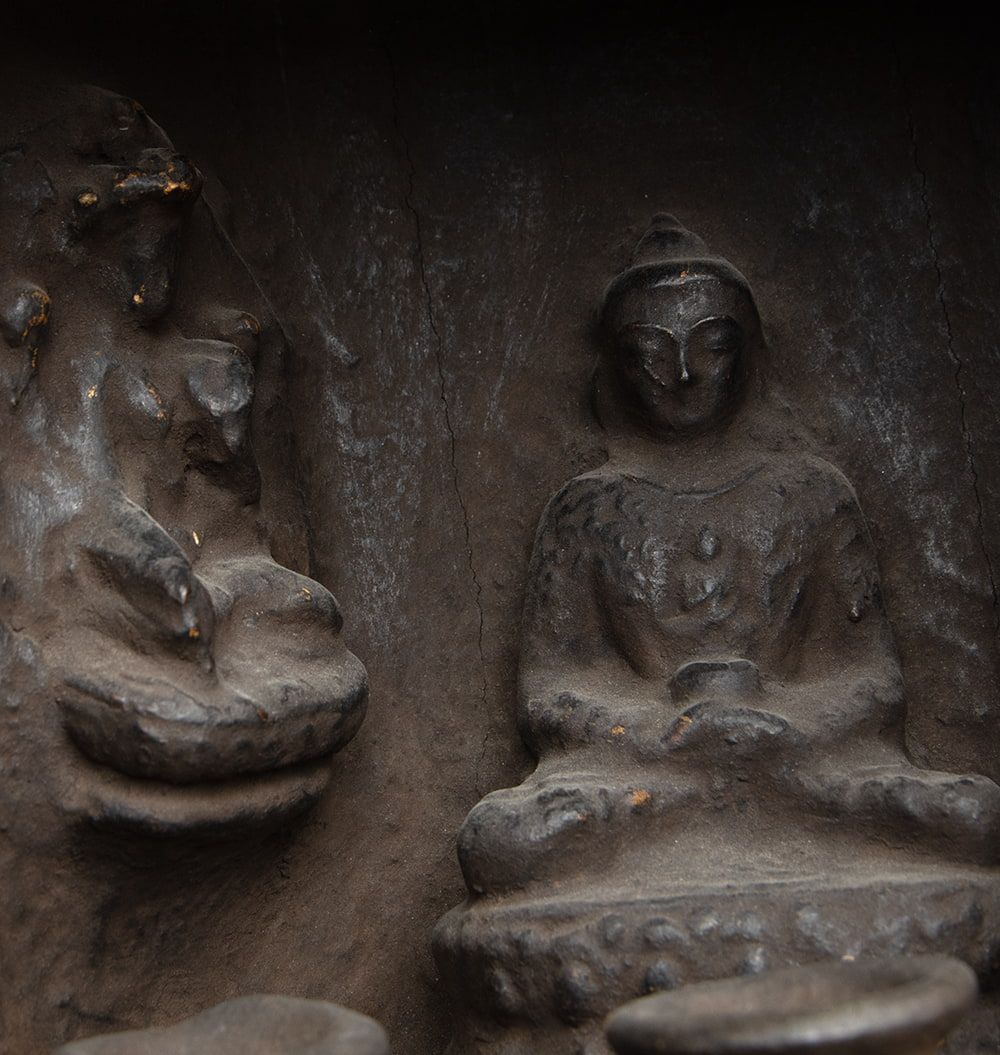 アミターバ - 阿弥陀如来が中に収められているチベット密教の厨子型をした仏像です。真ん中に一柱、横に2柱、合計3柱が彫られています。厨子とは、仏像・仏舎利・教典・位牌などを中に安置するための収納具のことを指します。