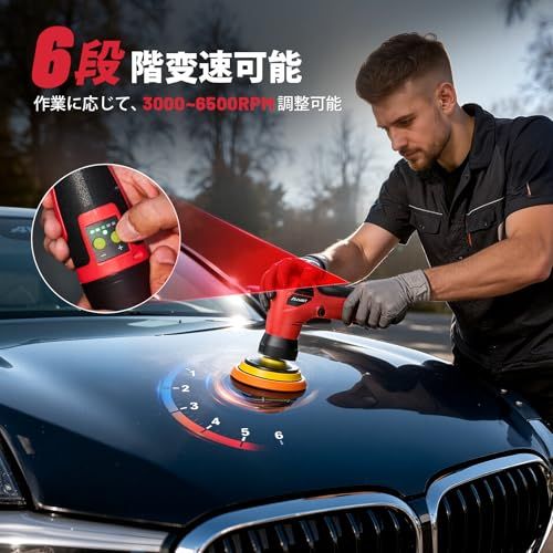 【プロ仕様超精密ポリッシャー】3000-6500 RPM広範囲変速で、車体スワール痕からドアミラー裏?シンク角部など狭小箇所の頑固汚れまで、精密研磨で完全除去!小型パッド (狭小エリア専用)と30/50/75mm標準パッド(局部仕上げ用)を標準装備。狭小筒所の精密研磨から平面艶出しまで全対応、軽自動車大型SUVまで多車種に適用可能!