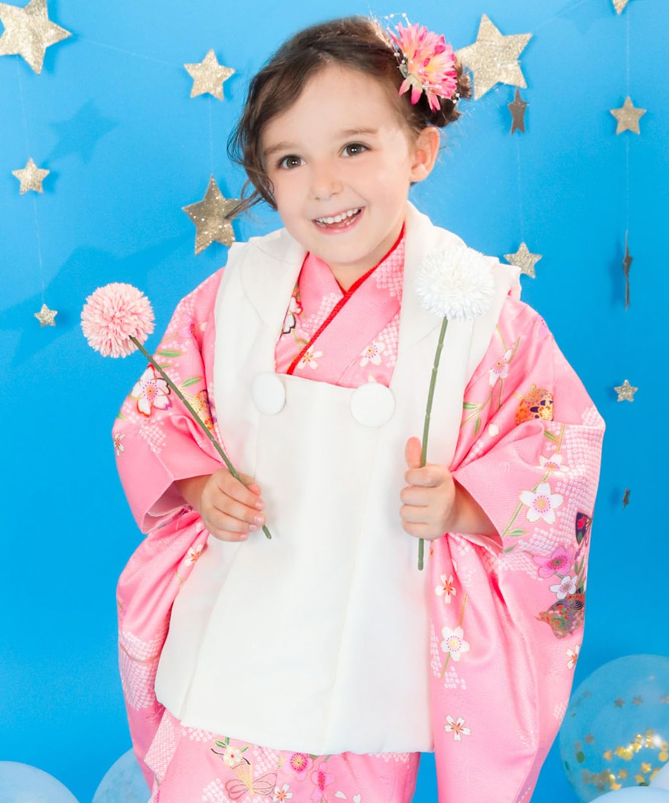 ・3歳の女の子への七五三祝いに。一生の思い出を彩るかわいいデザインの着物セットを揃えました。巾着や髪飾りなどの小物までセットになっているので、届いてすぐに着られます。