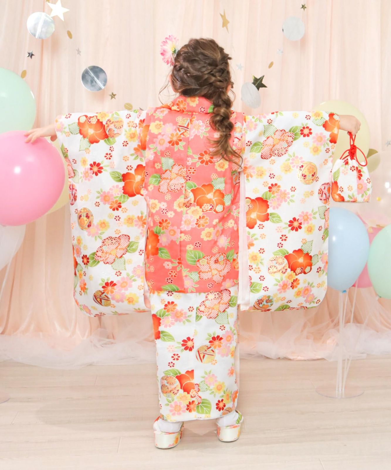 ・3歳の女の子への七五三祝いに。一生の思い出を彩るかわいいデザインの着物セットを揃えました。巾着や髪飾りなどの小物までセットになっているので、届いてすぐに着られます。