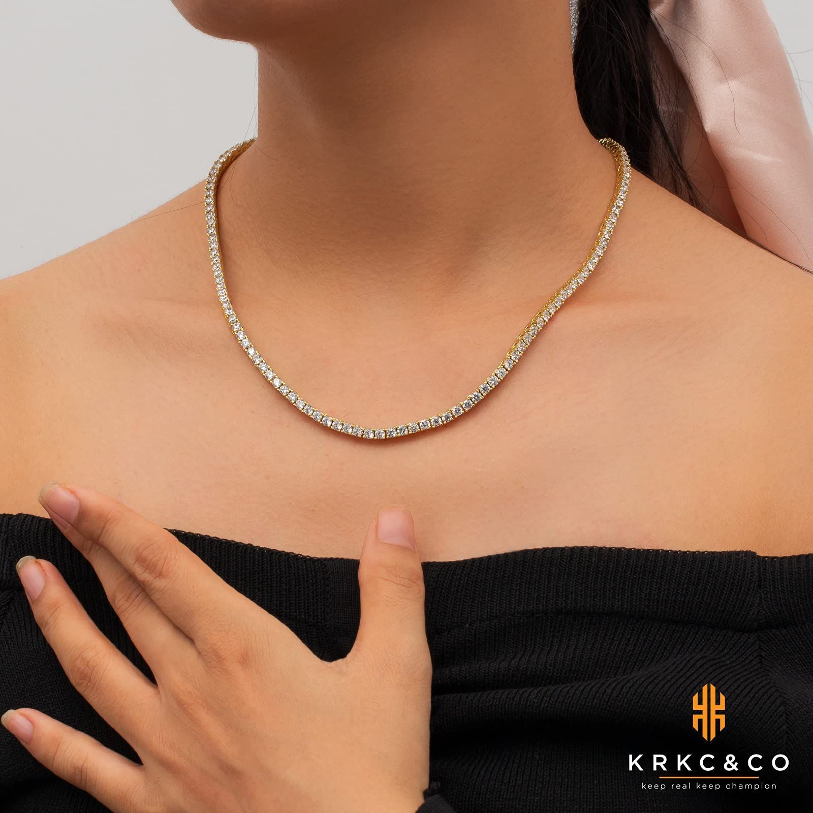 KRKC&CO テニスチェーン テニスネックレス 幅3/4/5mm CZダイヤ 14K金メッキ メンズ レディース チェーンネックレス ジルコニア ヒップホップ ジュエリー ブリンブリン B系 ストリート系 アクセサリー