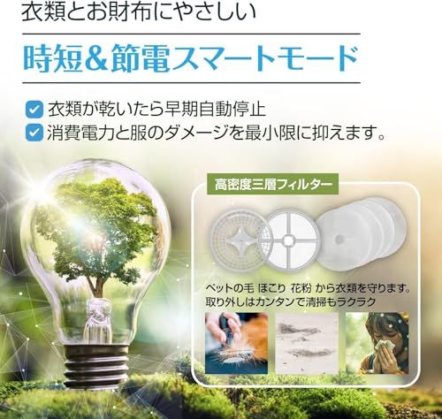 【大容量・高級感】最大容量6kgで一度に6人分の乾燥が可能、1人暮らしの方から56人のご家族向けに幅広くご活用頂けます。お部屋のインテリアとしても高級感のあるデザインです。AIスマートモード(乾燥自動検知終了モード)があります。