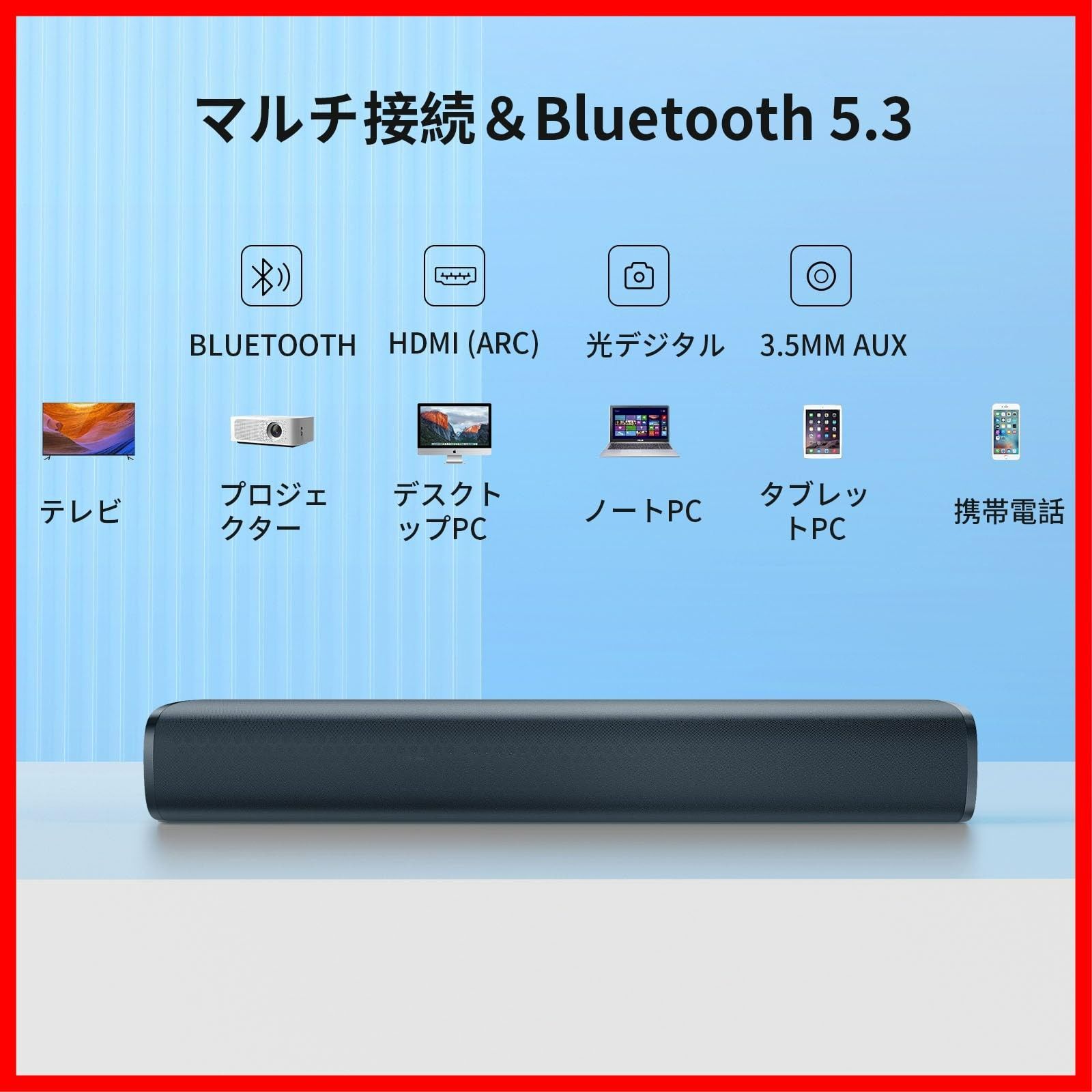 【簡単接続|幅広いデバイスに対応】HDMI(ARC)、Bluetooth、光デジタル、AUX 3.5mm端子などの接続方式に対応しており、テレビ、パソコン、ホームシアターなどのさまざまなデバイスと簡単に接続できます。配線の手間を減らし、すぐにお使いいただけます。