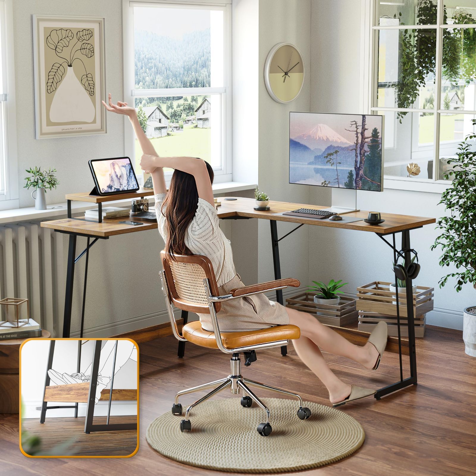 【広々とした空間】:L字型デスクは作業スペースが十分に確保されています。広い天板と開放的な足元スペースで、動きやすさを追求しました。自由な方向で作業ができるため、生産性が大幅に向上します。