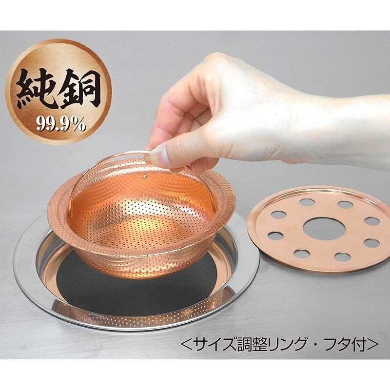 ■シンク・排水口嫌な臭い・ぬめりを抑える 浅型銅バスケット。現在お使いのキッチンのごみ受けと取り替えるだけの簡単設置で、排水口のお手入れがとても楽になります。■浅型タイプは角の無い一体型成形により、溜まった生ごみがつるっと取りやすい設計です。■1mmの排水穴が味噌かす等の細かいごみもしっかりキャッチ。■ミニキッチンタイプの排水口以外のほぼ全てのキッチンにご使用頂ける【サイズ調整リング】、【専用フタ】付き。■銅製品の特性上、仕様とともに10円玉の様に黒く酸化しますが、抗菌効果はなくなりませんのでご了承ください。