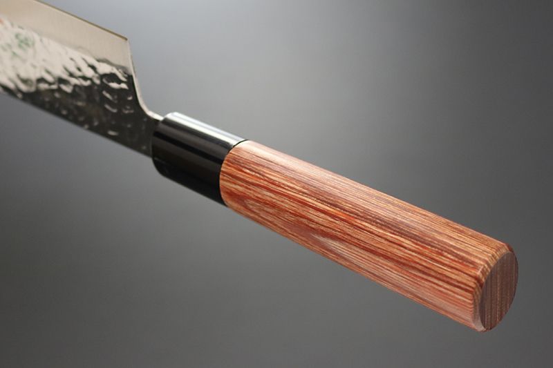 ハンドルは和式の美しい木目調の赤合板材を使用、ブレードは洋式の和洋折衷の包丁。サビにも強い、よく切れて高い定評のあるステンレス特殊鋼DSR-1K6(全ステン)を採用。槌目加工による凹凸は、風合いが美しく、食材の切り離れを助け、切れ味を助長。耐水性にも優れた赤合板丸柄は、握った感じも手に心地よく、鋭い切れ味とメンテナンスの良さを兼ね備えた包丁。信頼の兼常作。柄材 赤合板/プラスティック桂