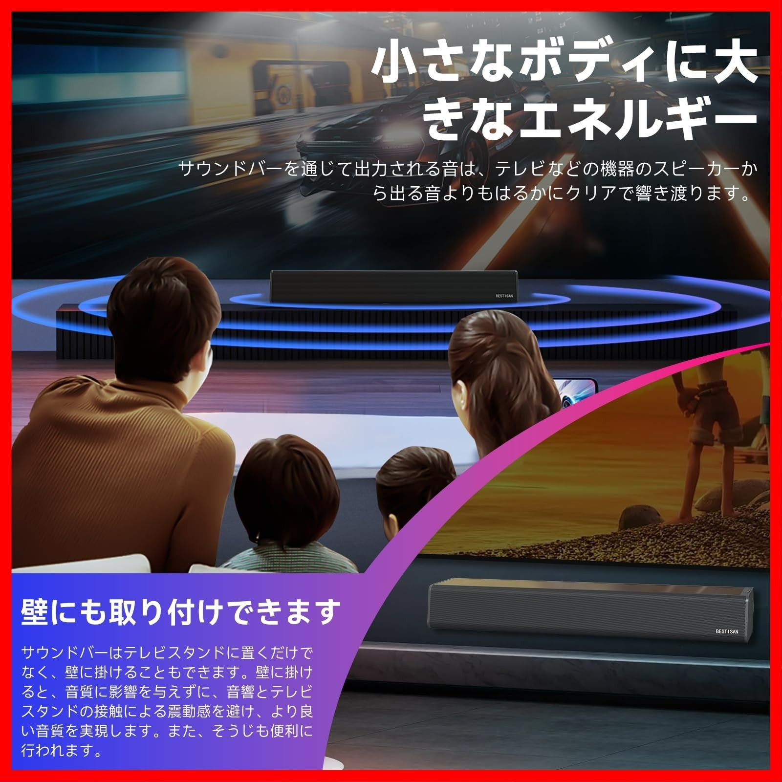 【小さなボディに大きなエネルギー】:サウンドバーは2つフルレンジスピーカーを装備しており、拡音効果は優れています。立体サラウンド音響効果を提供し、部屋全体に高品質の音を満たします。歪み率は1%未満である、原声に忠実な音楽を出力し、音質を低下させない。