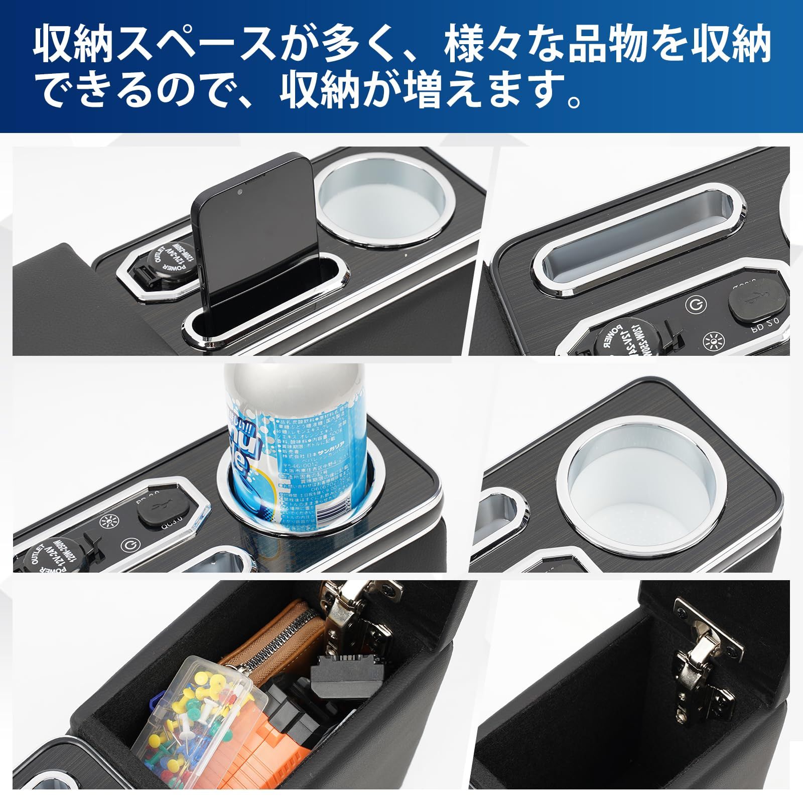 【大容量の収納スペース】ハスラー専用明るさ調節7色変換アームレストは、運転席と助手席の間のスペースを効果的に活用します。ご愛車をスッキリになります。スマートフォンとドリンクを便利に専用収納スペース;そのほか、携帯電話や腕時計、イヤホンなど様々な物の収納スペースも増えます。小さな品物を整理できます。