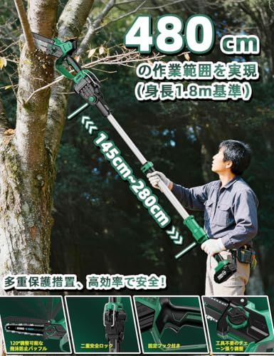 【1台2役・2026新型 高枝チェーンソー・ハンディチェーンソー】KIMO 8インチ チェーンソー 充電式は、革新的なポール着脱式構造を採用し、充電式チェーンソーと高枝切り電動チェーンソーとして自由に切り替え可能。伸縮ポールは 145cm280cm の範囲で無段階調節に対応し、組み立て後に最大伸長させると、約480cmの作業高さを実現(身長1.8m基準)。はしごの設置や高所作業の危険性を回避し、安全かつ効率的に高所の切断作業を完了できます。果樹、木材、竹、庭木など様々なシーンでの切断作業に適しています。高所の難易度の高い作業から手元の軽作業まで、一台で全てカバーする高機能チェーンソーで、あらゆる切断ニーズを満たす理想的な選択肢となります。