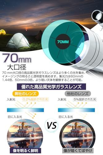 【高品質光学システム&1.25インチ大直径天頂ミラー】口径70mm、焦点距離400mm の屈折式天体望遠鏡は一般的な天体望遠鏡と異なり、改良された1.25インチ大直径天頂ミラーと合わせて、広視野でより多くの光を集め、光透過率は最大99.9%に達し、低い光の反射率、映像のにじみや明るさ不足を解消し、本来の色を保ちながら、より鮮明でくっきりした視界を楽しめます。さらに、高品質FMCマルチコーティング光学レンズを採用して、像面が平坦で色収差をバランスよく補正した鮮明な像が特徴です。