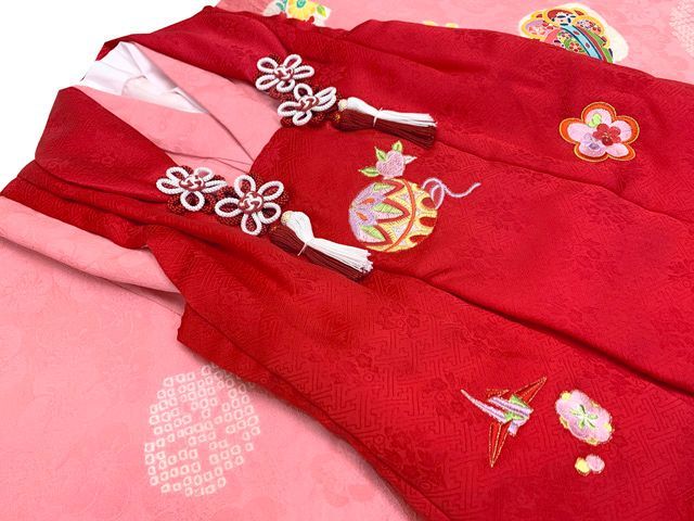 七五三 着物 3歳 正絹 フルセット 女の子 友禅 絵羽柄の着物 被布セット 赤xピンク 鞠と鈴 i 905 set