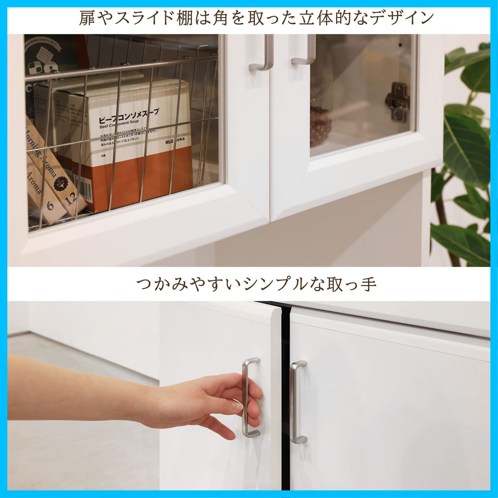 【特長】上部は中が見えて収納物が見やすいガラス扉。オープンスペースの棚は耐荷重15kg、内寸幅52.7cm。単機能電子レンジの設置に。スライド棚は炊飯器などの収納に便利です。スライド棚のスペースには2口コンセントと配線穴があります。