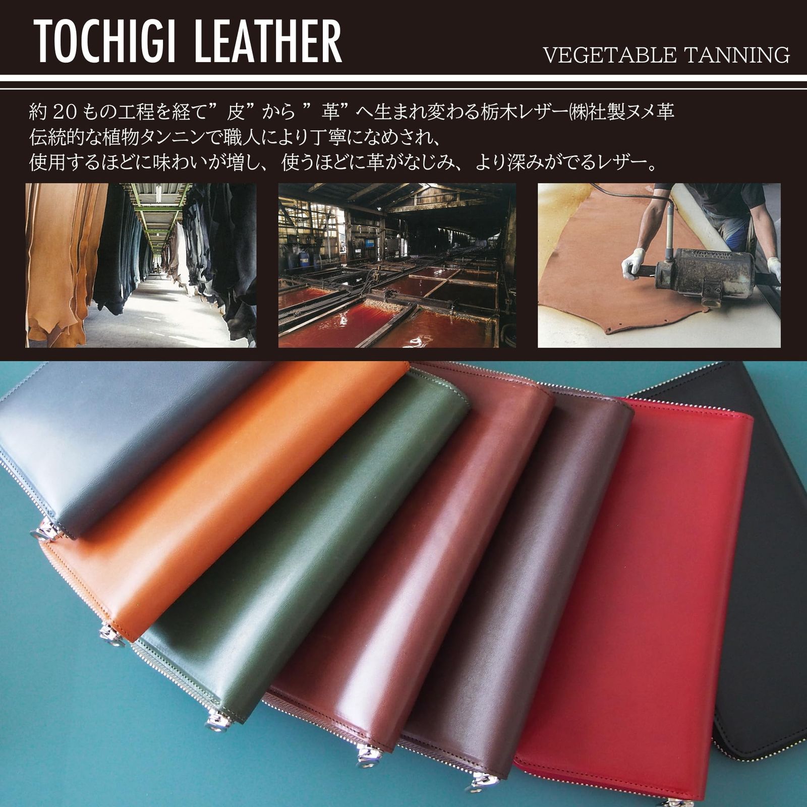 【日本を代表する国産革、栃木レザー】 しなやかで、丈夫。そして年月が経つにつれて味わい深く変化(エイジング)します。栃木レザーは、日本のみならず、世界で評価されています。栃木レザーは伝統的な方法を職人が手間隙をかけて行うことでできるタンニンレザーの最高峰です。じっくりとなめされた革は、しなやかで頑強でありながら使い続けるうちに味わい深く変化していきます。栃木レザー株式会社は日本国内で唯一、昔ながらの伝統的なピット製法で植物タンニンなめしを行っている 皮革メーカーです。 あくまでも天然素材としてのタンニンなめし革の製造にこだわっており、手間のかかるなめし工程を頑なに守り続け、環境に配慮した素材を提供し続けています。 栃木レザーの魅力は「エイジング」と呼ばれる経年変化。使い込むほどに味が出て、自分だけの愛着あるレザーになっていきます。 使い込んで初めて完成に近づく栃木レザー。ぜひ、使い込み、自分だけのレザーアイテムを作って下さい。