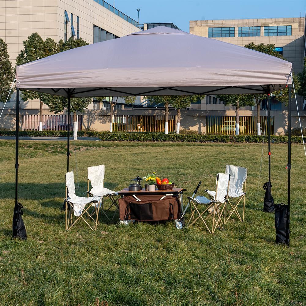 【設営も撤収も簡単!】 組み立ては広げて立ち上げるだけなので簡単。 ワンタッチボダンで押すだけで、固定が解除できる、撤収もらくらく!タープテントの支柱にある調節ボダンで、高さを2.36m /2.46m / 2.56mで3段階調節も可能です。