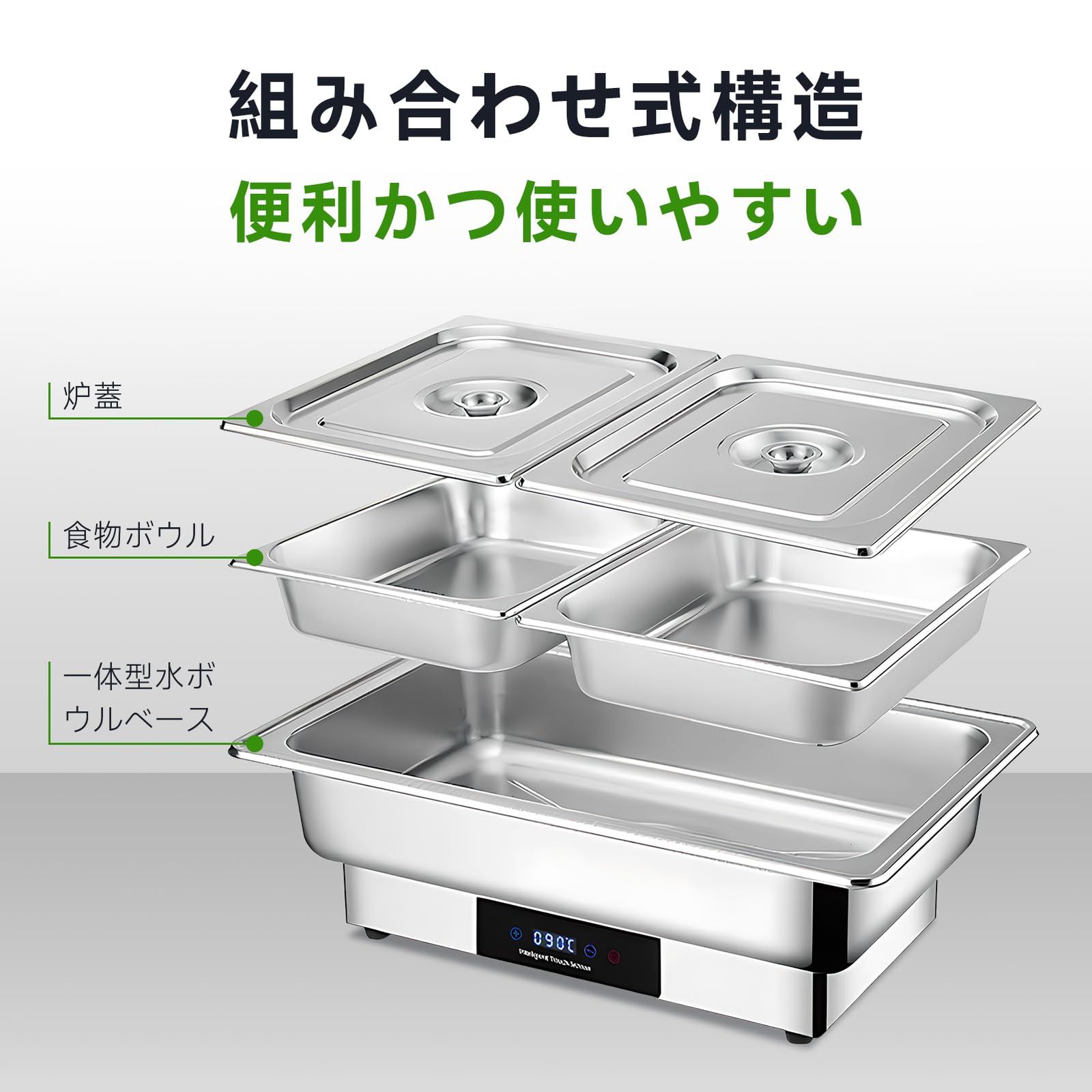 ビュッフェサーバー チェーフィングディッシュ 湯煎式 chafing dish 13 5 L food warm 平蓋 保温調理鍋 ステンレス製 温度調整加熱ウォーマー温度制御 保温トレイ 電気ミールストーブ100 v 角型3連